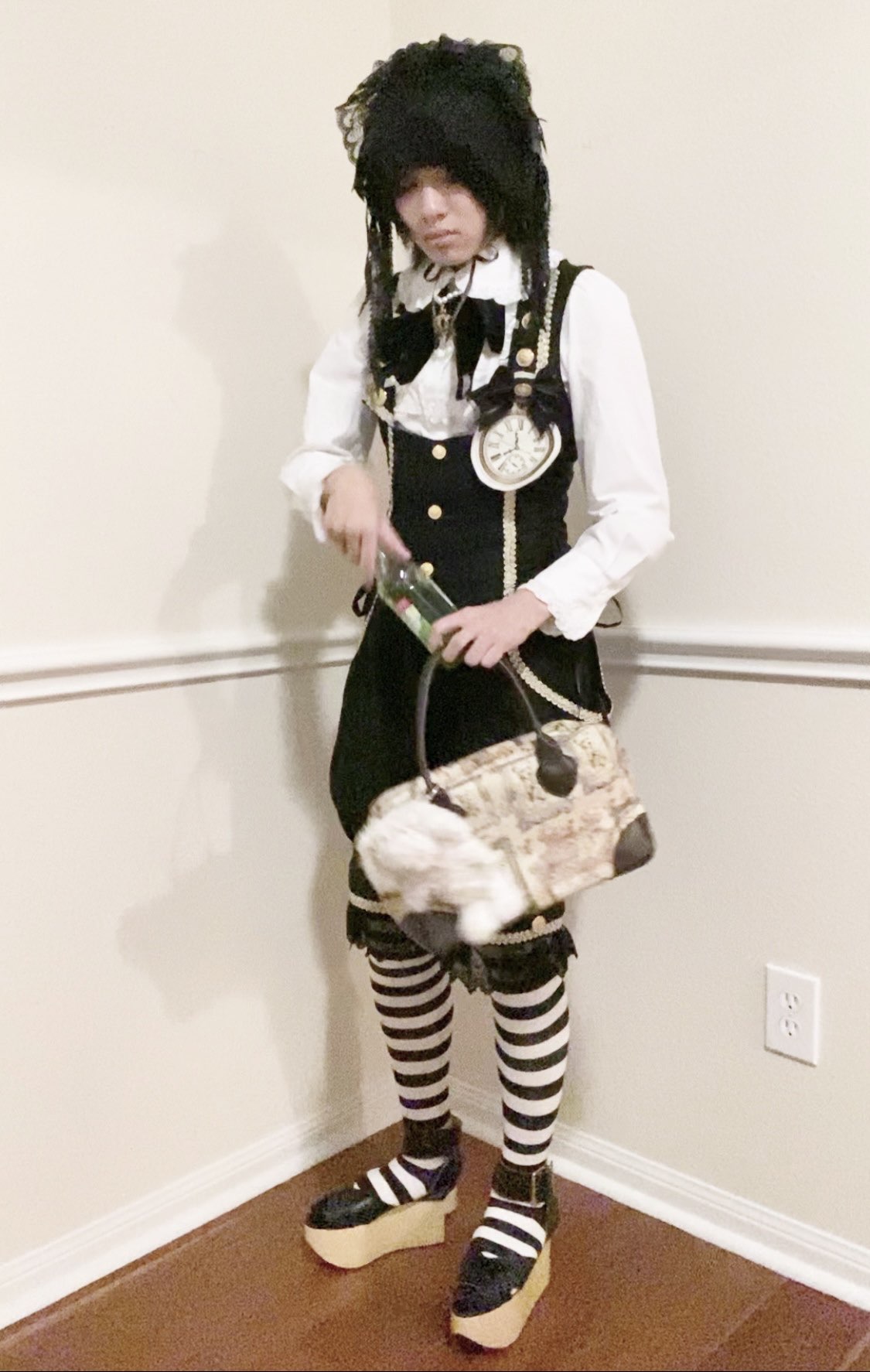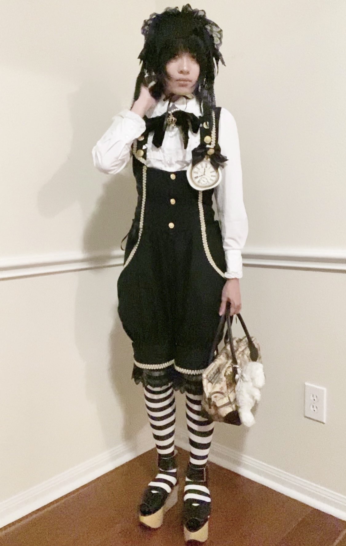 2025.11.30Most AATP productions are designed for gothic taste, but they'll occasionally release items that lean more into the youthful themes and かわいい iconography of ouji. The apple doesn't fall far from the tree. With WRS, its theme is the Rabbit's pocketwatch. I think "sweet" is distinct from gothic ouji by construction and texture regardless of colors as many have been lead to believe. Even though it's black, it's not sleek nor regal like the common goth ouji. Sweet ouji does not need texture to be striking. When it strikes, it does so by invoking pop culture such as Alice In Wonderland. That being said, WRS is a very soft and resilient piece with a breathable rayon-poly blend (so yes, I wear it during the summer.) |