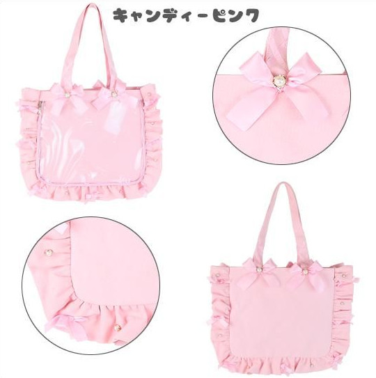 These are the Uta Prince Sama official character base bags. Designed on a monochromatic scale, and they have these rings on the window where you can attach/detach the handles with velcro. Because the window wraps around, I have double-sided freedom and I can even decorate the sides. The handles are made of PU leather which I usually avoid because they always eventually peel. This is why I was sad to let go of the few bags I had before Uta-Pri that prevented the peeling situation.